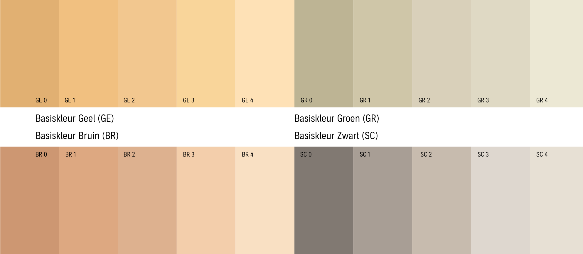 Beschikbare tinten per basisgrondkleur (van donker naar licht)